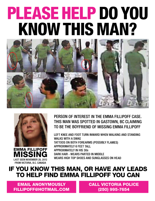 Emma Fillipoff (born January 6, 1986) is a Canadian woman who has been missing since November 28, 2012, vanishing from in front of the Empress Hotel in Victoria, British Columbia, at the age of 26.